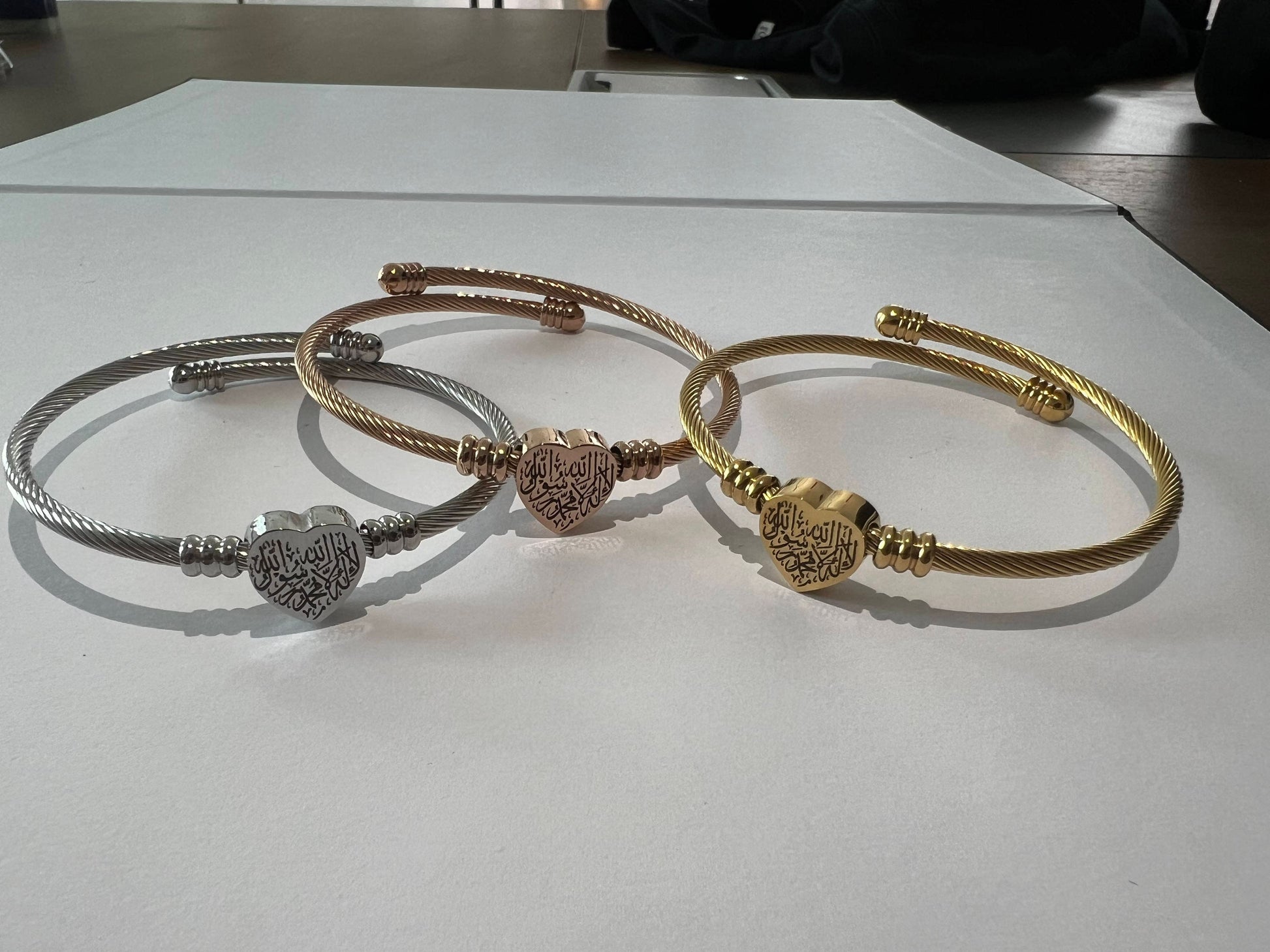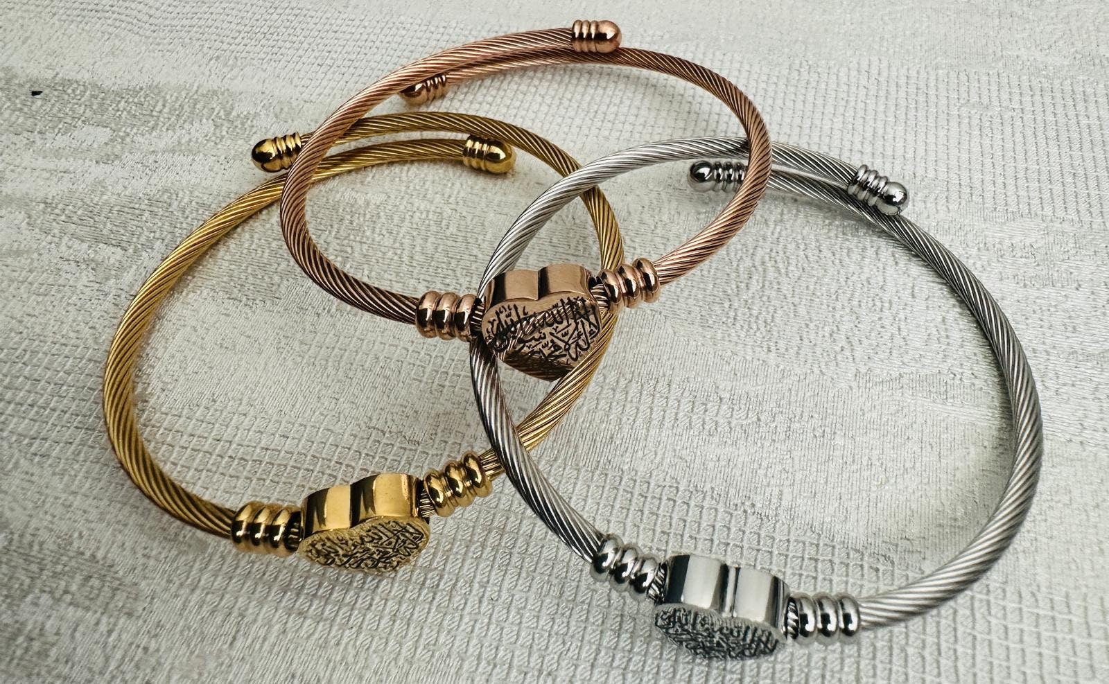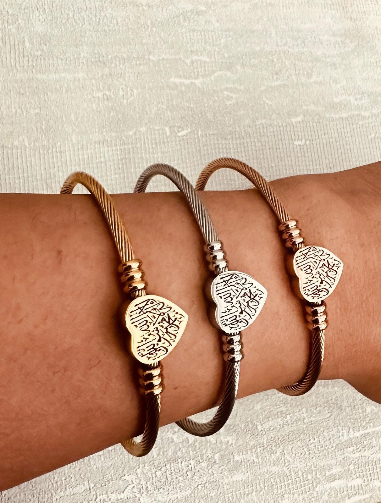 DETAILS: Allah Heart Shaped Bracelet, a stunning blend of faith and fashion. This exquisite bracelet features a heart-shaped charm, beautifully engraved with the name "Allah," symbolizing devotion and spirituality. Crafted from high-quality materials and available in three luxurious finishes—Silver, Gold, and Rose Gold—this piece is designed to complement any outfit. The bracelet is not only a stylish accessory but also a meaningful expression of faith, making it perfect for daily wear or special occasions. Whether as a gift for a loved one or a cherished addition to your own jewelry collection, the Allah Heart Shaped Bracelet is a timeless piece that embodies elegance and reverence.
