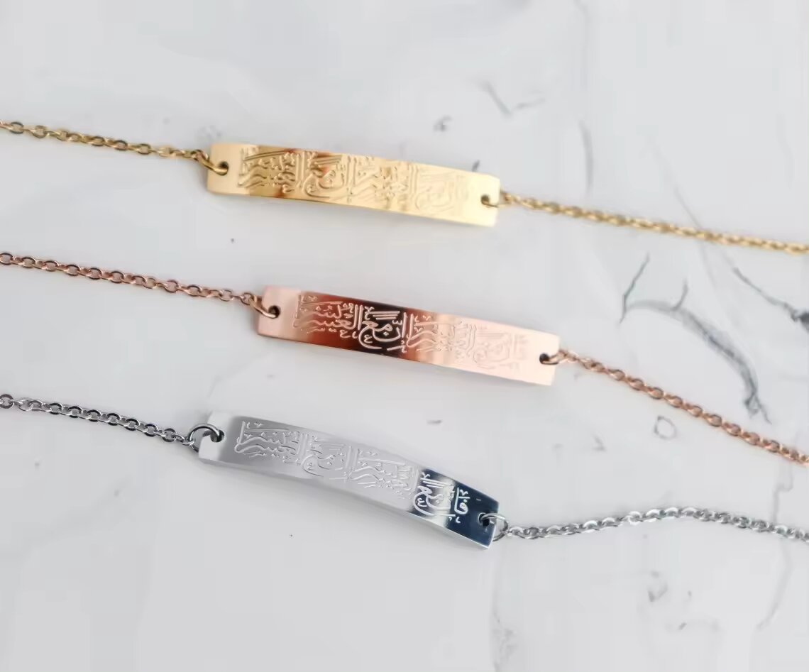 - The Arabic engraving of the holy verse on this beautiful Bracelet crafted from high-quality gold plated stainless steel. This beautiful piece is more than just an accessory. It's a powerful reminder of faith and a cherished symbol of Islamic tradition. Handmade with meticulous care, this bracelet is perfect for yourself or as a thoughtful gift for a loved one.